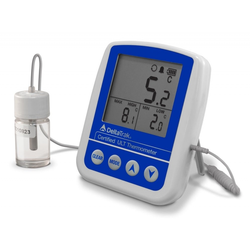 Termômetro digital com uma sonda externa imersa em glicol que amortece mudanças repentinas de temperatura e garante que as medições não flutuem devido à abertura frequente da porta do refrigerador ou do freezer. Da mesma forma, este sistema reproduz um ambiente semelhante ao qual estão expostas as soluções armazenadas que costumam ser utilizadas em laboratórios e farmácias. Também possui um sensor interno para controlar a temperatura externa da geladeira. Inclui certificado de conformidade do fabricante que garante a conformidade com as especificações publicadas, personalizadas com seu número de série.