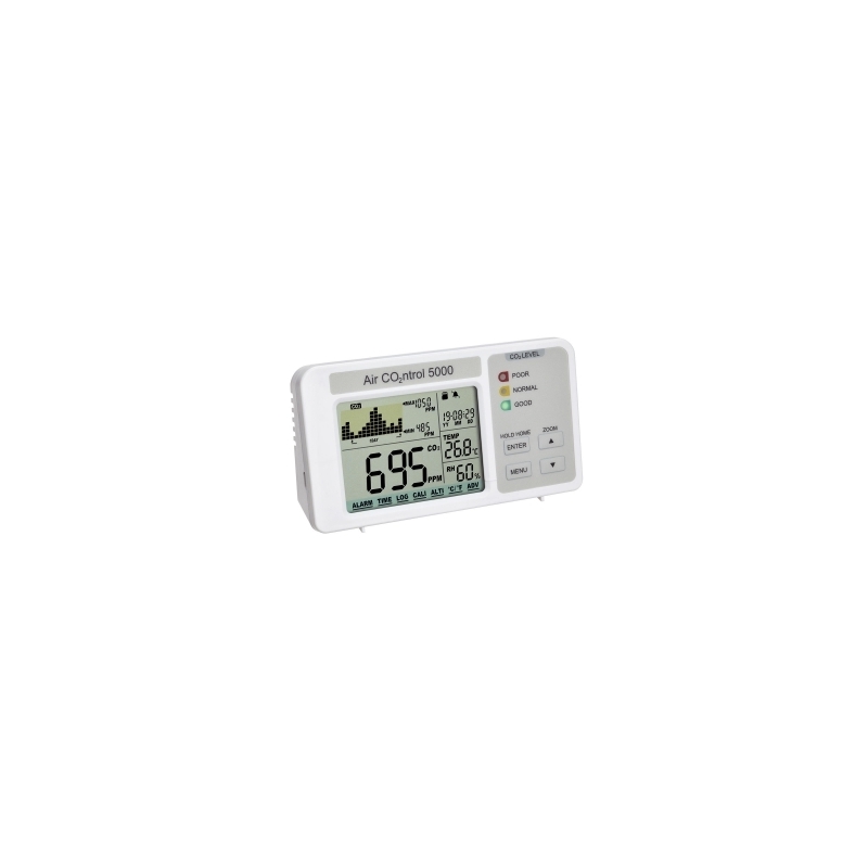 Além do conteúdo de CO2, o aparelho mede a temperatura e a umidade do ambiente e informa a data e a hora. O display mostra o conteúdo atual de CO2, bem como um gráfico com os valores anteriores e os valores máximo e mínimo correspondentes. O eixo do tempo do gráfico de barras pode ser ajustado de forma variável para um minuto, uma hora, um dia ou uma semana. Opcionalmente, os últimos valores medidos de temperatura e umidade também podem ser exibidos claramente no gráfico.