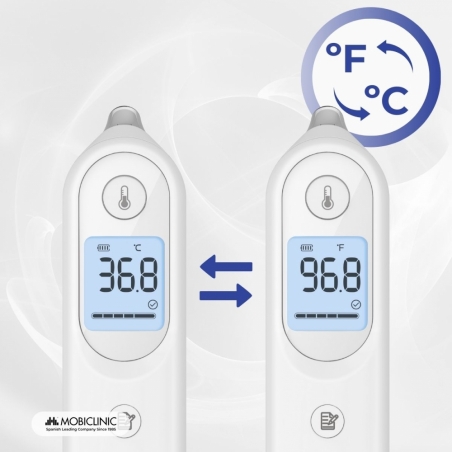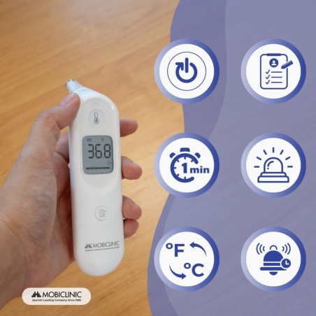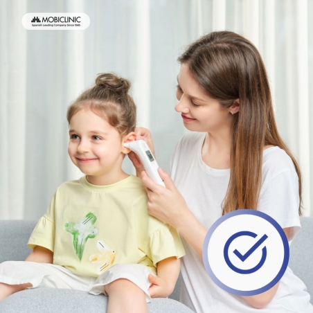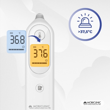 Sua ponta macia e moldada foi projetada para uso seguro no ouvido. Possui um sistema de alerta inteligente que detecta se a temperatura ultrapassar 37,5 °C e emite um bipe longo seguido de três curtos, juntamente com o visor laranja, alertando o usuário de forma clara e rápida. Outra grande vantagem é sua memória interna, que armazena as últimas 7 medições, permitindo o monitoramento da evolução em casos de febre prolongada.