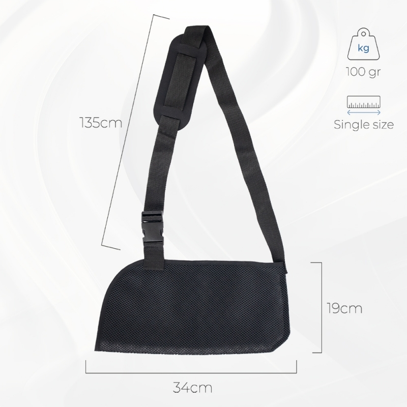 A escolha do tamanho certo suporte para braço é essencial para assegurar a eficácia terapêutica do produto e para garantir a sua vida útil. Além disso, esta suporte para braço imobilizadora é muito fácil de usar, pois basta abrir o saco do painel 3D e posicionar o antebraço do utilizador dentro do saco, de modo a que o utilizador coloque o cotovelo na parte fechada da órtese e a mão na parte aberta. A correia de suspensão deve então ser passada por cima do ombro oposto ao lado a ser tratado e a altura ou flexão ajustada conforme necessário.