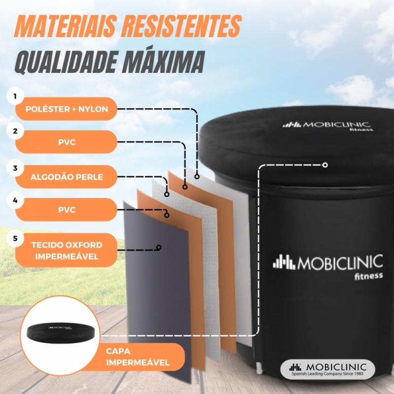 RESISTENTE E EFICIENTE Construída em PVC e tecido Oxford impermeável de alta qualidade, a banheira é robusta e eficiente na retenção de temperatura . Quer prefira água quente ou fria, a piscina manterá a temperatura desejada para que possa desfrutar de uma óptima experiência de recuperação muscular. A temperatura máxima alcançável é de 50º.