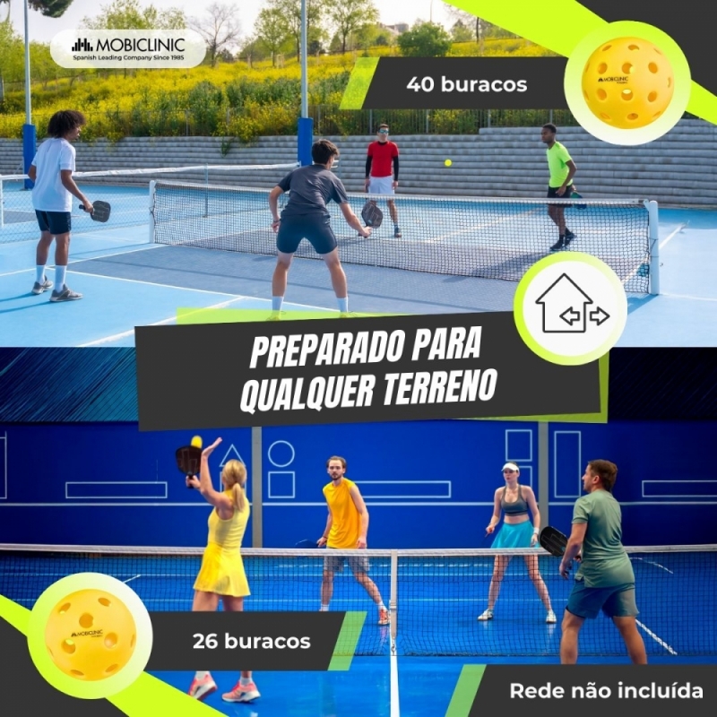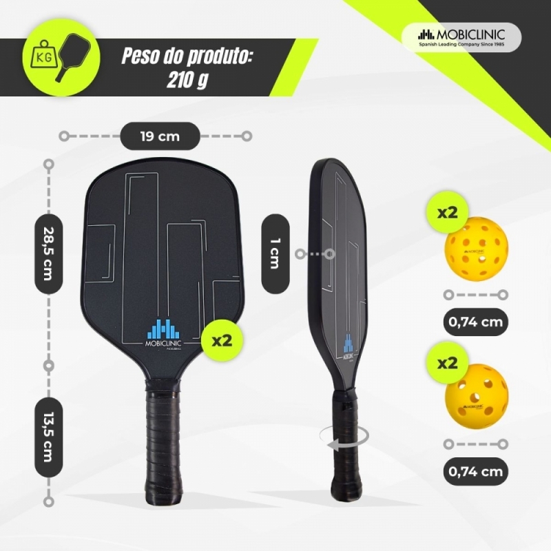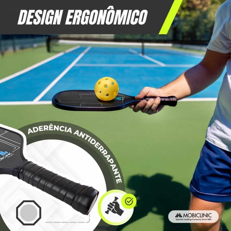 O conjunto Mobiall Pickleball é a escolha perfeita tanto para iniciantes quanto para jogadores experientes que buscam uma atividade física completa e divertida. Inclui duas raquetes feitas de fibra de vidro com núcleo de polímero em formato de colmeia, um material que oferece uma combinação de controle e potência durante o jogo. Suas alças ergonômicas com empunhadura antiderrapante e absorvente garantem uma pegada confortável.