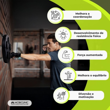 A instalação é simples: basta colar os adesivos em uma superfície lisa, seja em ambientes internos ou externos, dando a você a liberdade de treinar onde quiser.