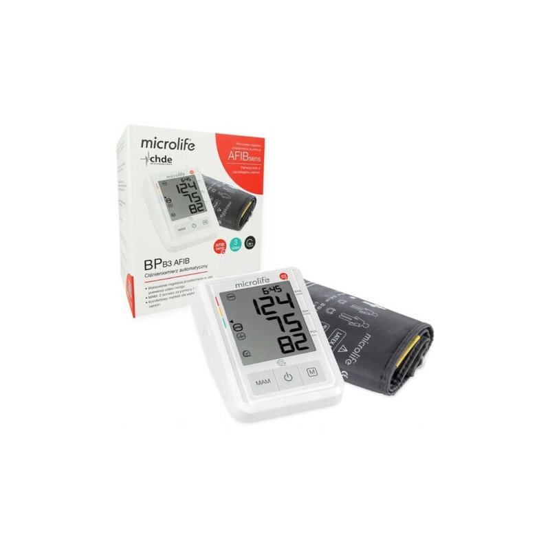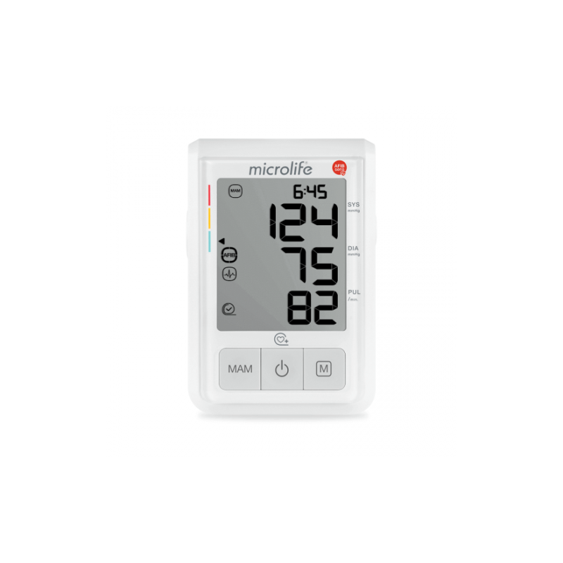 O B3 AFIB é um monitor de pressão arterial que, graças à tecnologia AFIBsens, detecta de forma confiável a fibrilação atrial (FA) durante a medição da pressão arterial no modo MAM (3 medições com 1 clique).