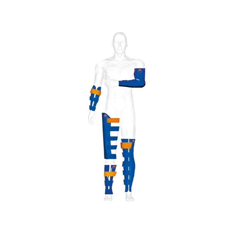 Um sistema ideal para imobilizar todas as extremidades do corpo, de forma totalmente segura e eficaz. O kit ou conjunto Blue Splint é composto por 5 talas, para o antebraço, punho, cotovelo e tornozelo, braço e perna. Cada uma das talas pode ser modelada, ajustando-se às necessidades, características e situações do paciente, oferecendo uma forma única de tratamento de membros fraturados ou deslocados.