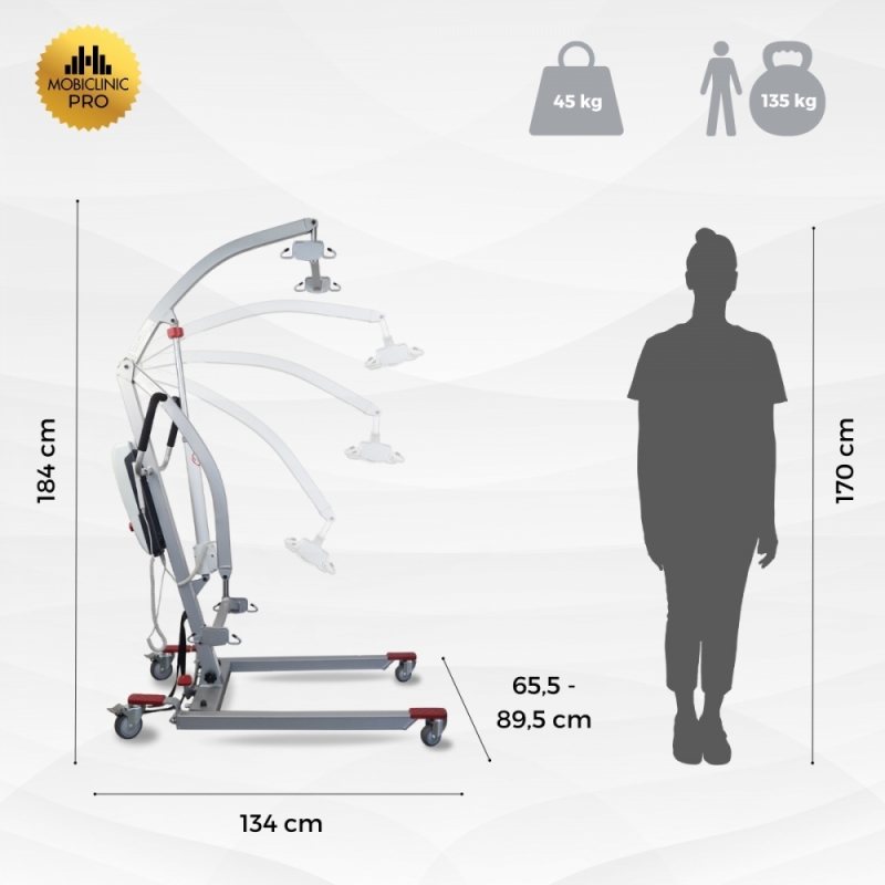CAPACIDADE: Este guindaste ortopédico suporta um peso máximo de 135 kg. Quanto à distância de elevação, é de 90 a 174 cm. Além disso, seu raio de giro é de 127 cm, enquanto o braço gira cerca de 180º. Pode descer a uma altura de aproximadamente 20-30 cm do solo.