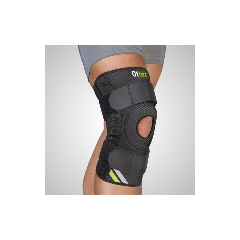 FORMA ANATÔMICA: Elasticidade uniforme em todas as direções: melhor adaptação, ajuste e colocação. Não limita a mobilidade. Ajuste por faixas largas de velcro para favorecer a estabilização. Alojamento para a patela, evitando pressioná-la e facilitando a flexo-extensão. Hastes espirais laterais. Impulsor em material viscoelástico.