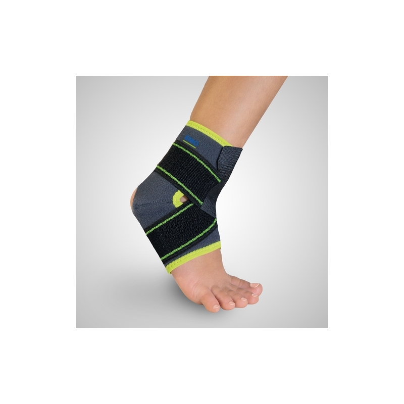 Este estabilizador de tornozelo é feito de tecido elástico e respirável. É aberto na panturrilha para fácil colocação. Além disso, incorpora uma fita de fixação elástica que permite a realização de uma bandagem estabilizadora.