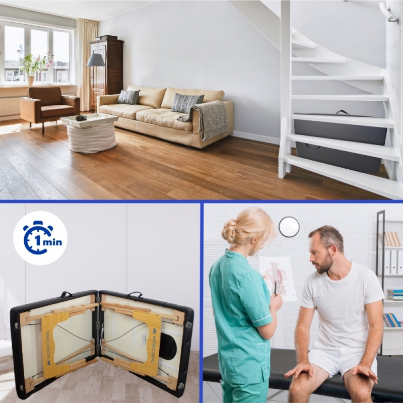 É dobrável, o que permite a sua utilização também por profissionais de saúde que trabalham em casa. Conta também com um sistema de dobragem e abertura automática.