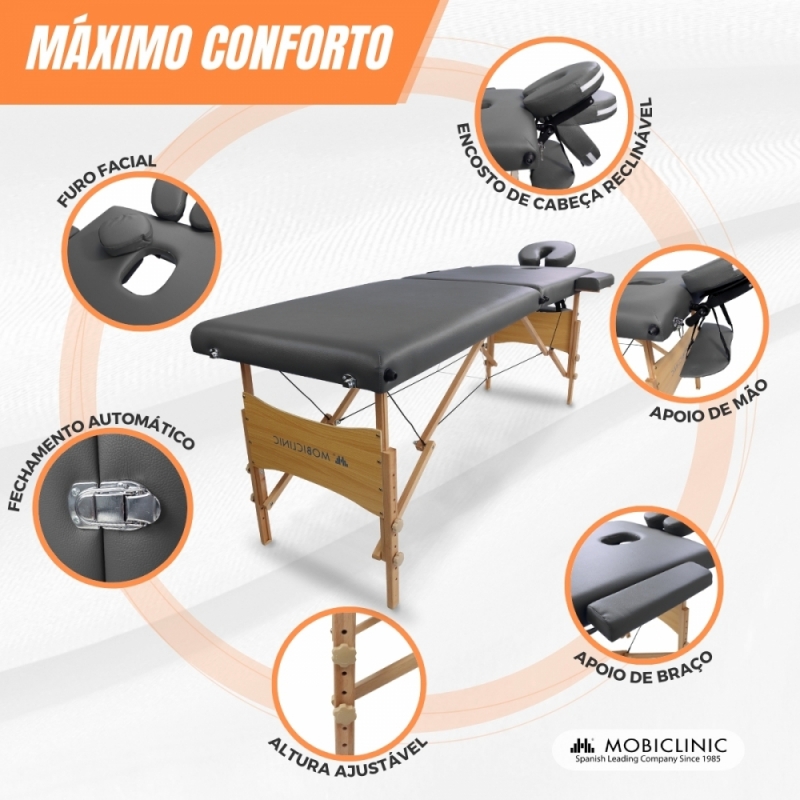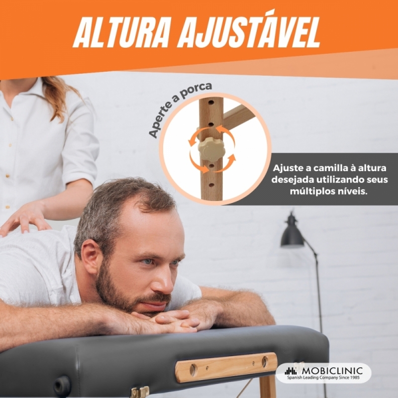 É uma mesa de massoterapia ajustável em altura através das pernas, tendo vários níveis para adaptá-lo ao que é mais confortável para você.