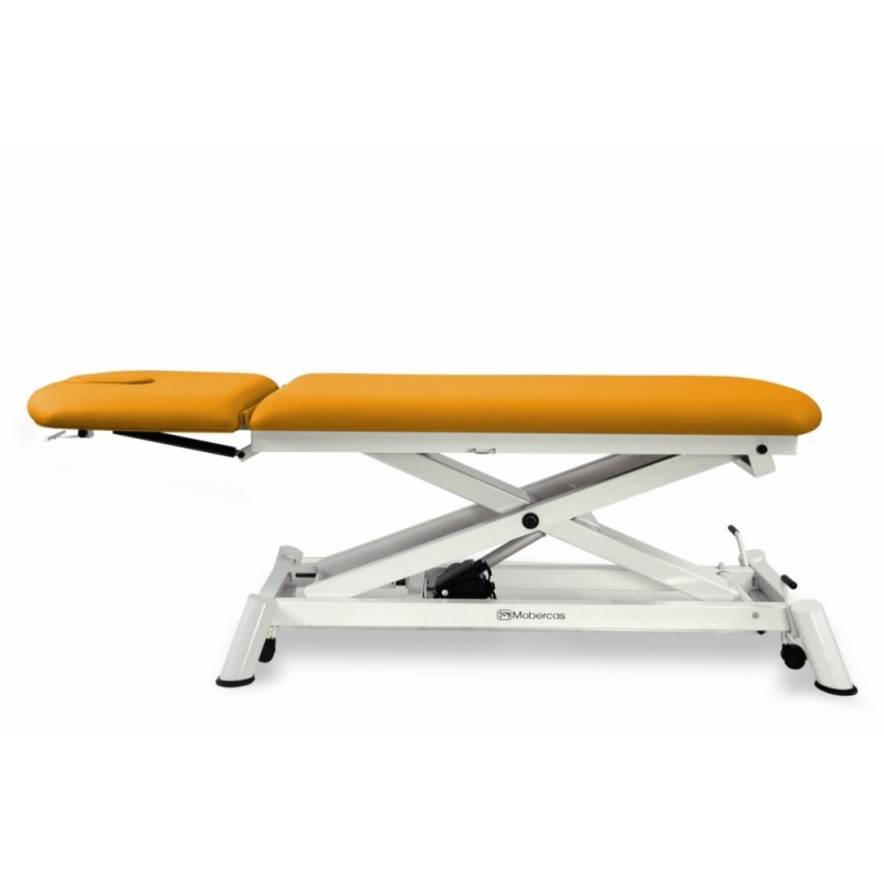 Mesa de exame elétrica de 2 seções com encosto reclinável negativo, suporte para rolos, plugue frontal e rodas retráteis.