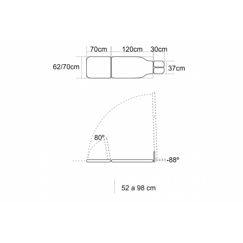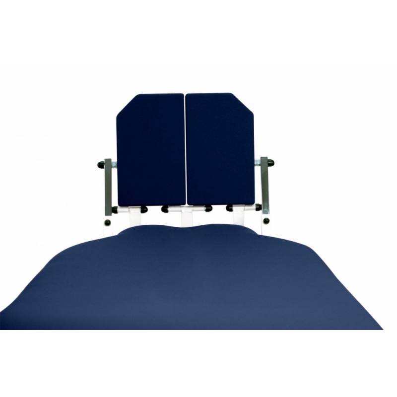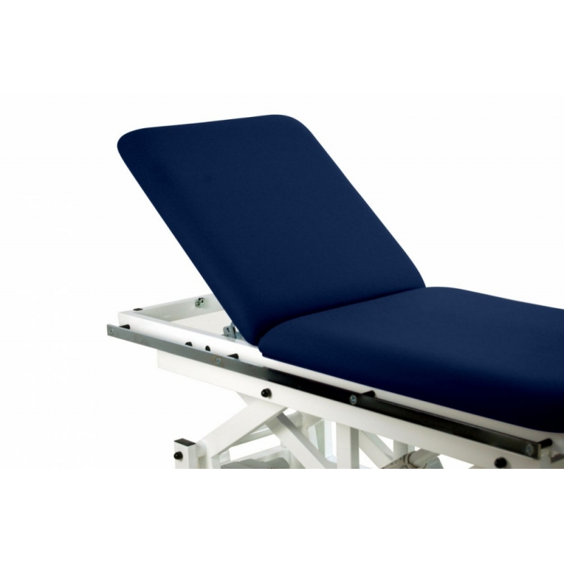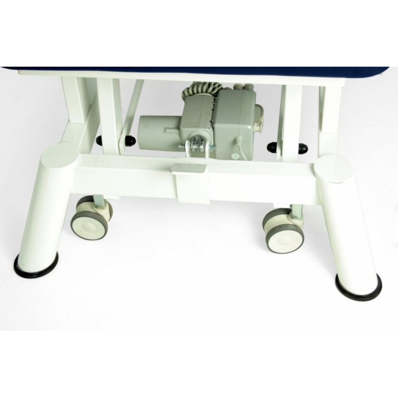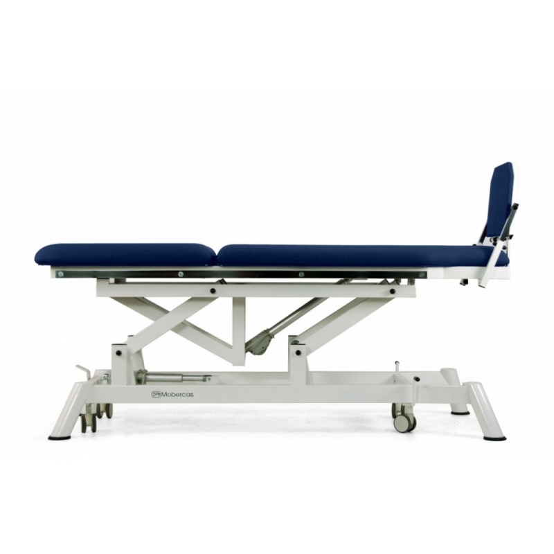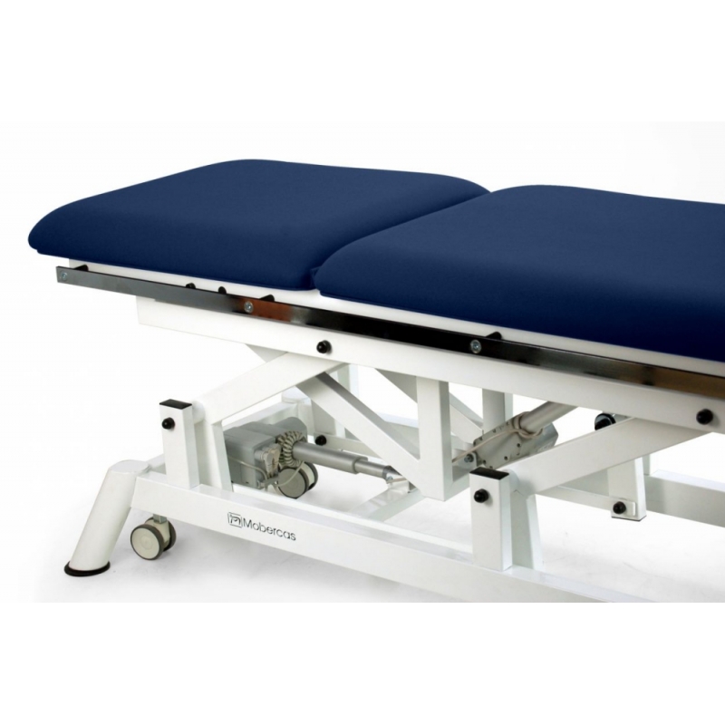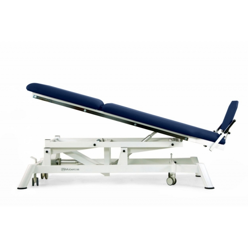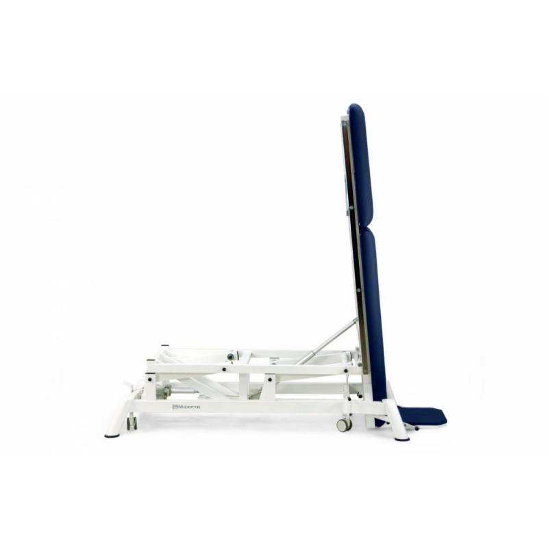 Maca de mesa vertical / inclinada de 2 seções com regulagem motorizada de altura e verticalização, apoio para os pés independente e regulável (inclinação / descida), encosto elevável, guias laterais para fixação das correias de fixação e diversos acessórios e rodas retráteis.