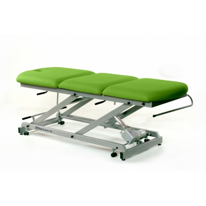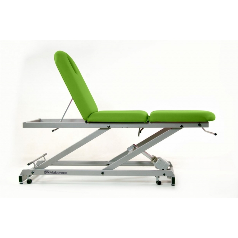 Marquesa de exame elétrica de 3 seções com dobra central manual, porta-rolos, tampa frontal e rodas retráteis.