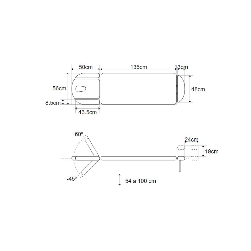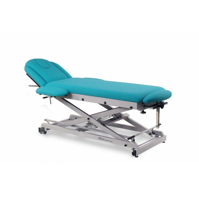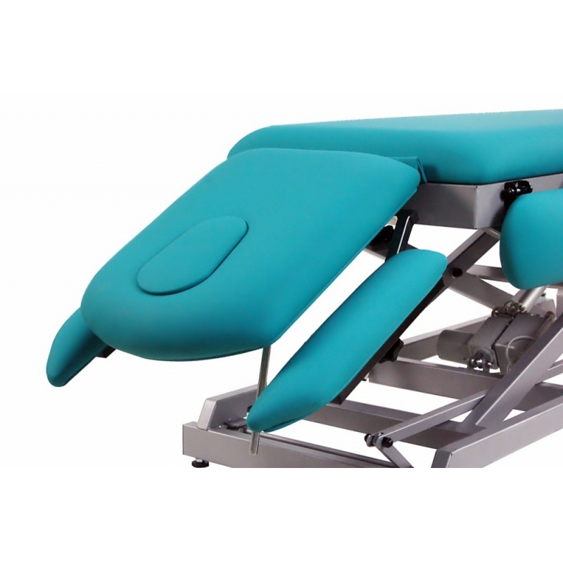 Maca elétrica multifuncional para osteopatia de 7 seções com elevação reta sem deslocamento lateral, plug facial e rodas retráteis. Encosto reclinável negativo com braços, braços laterais e apoio para os pés ajustável e removível.