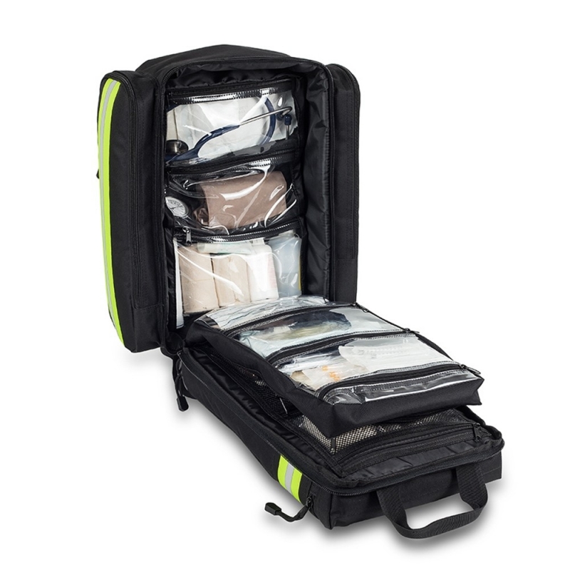 A mochila de emergência sanitária conta com divisórias internas transparentes de diferentes tamanhos, que se adaptam às necessidades e medidas que um equipamento de primeiros socorros exige.