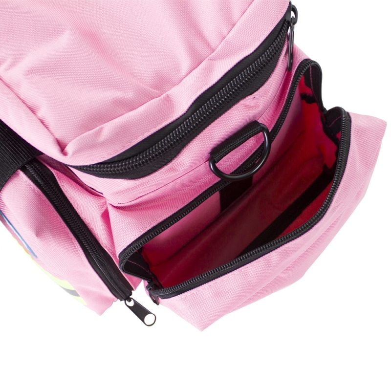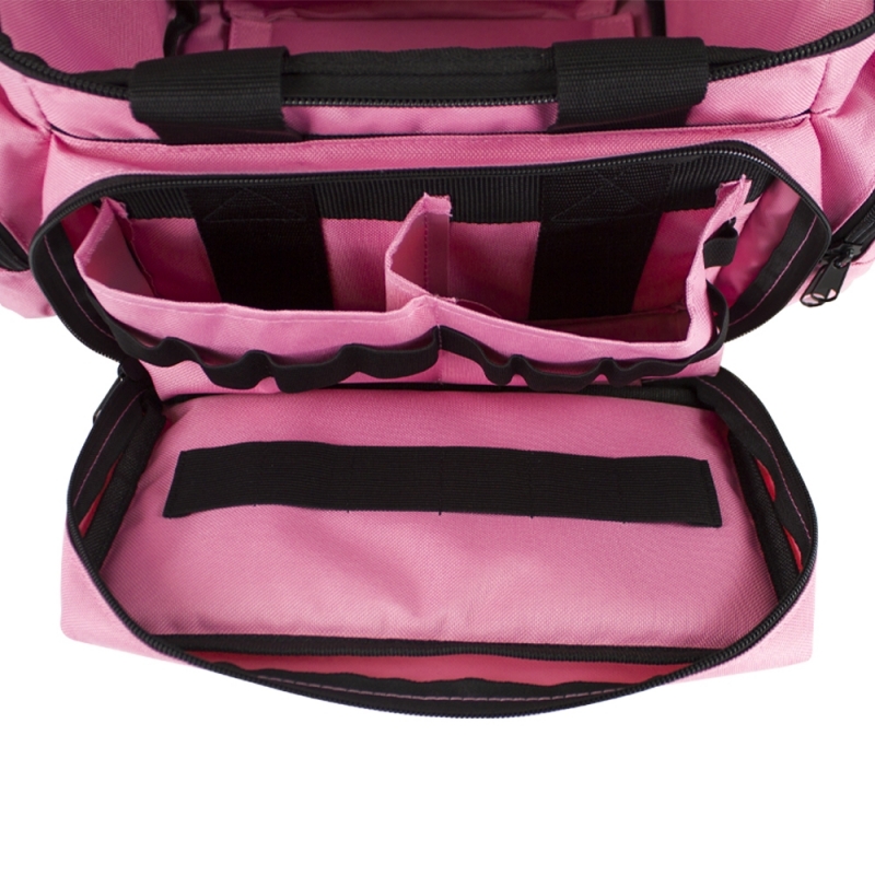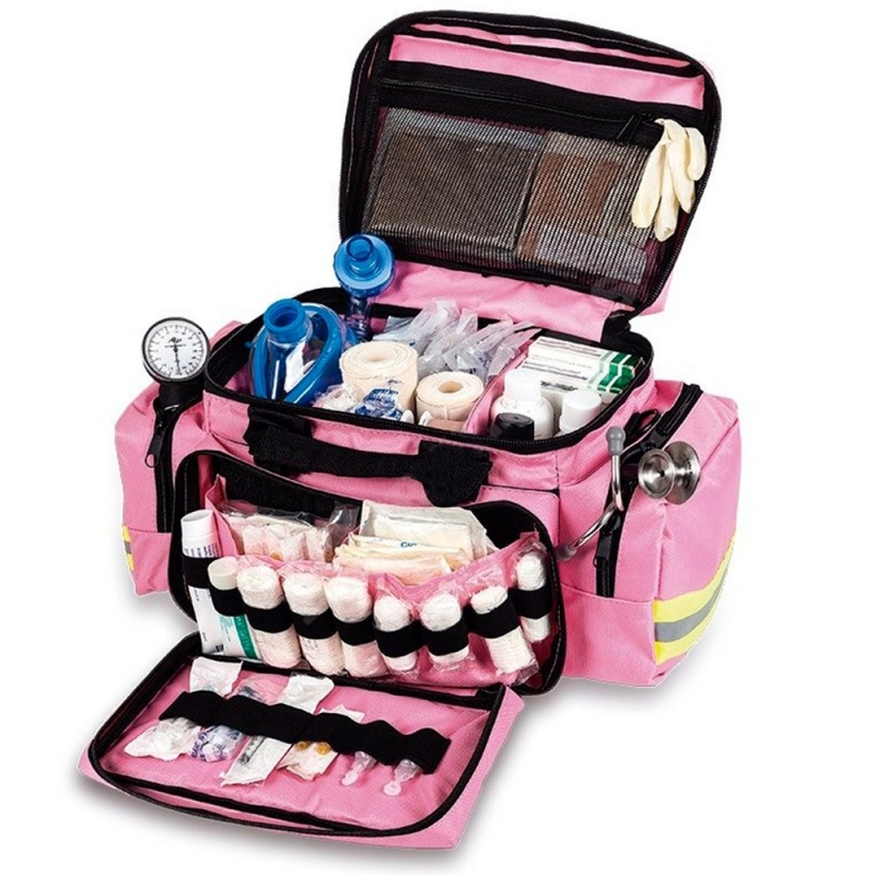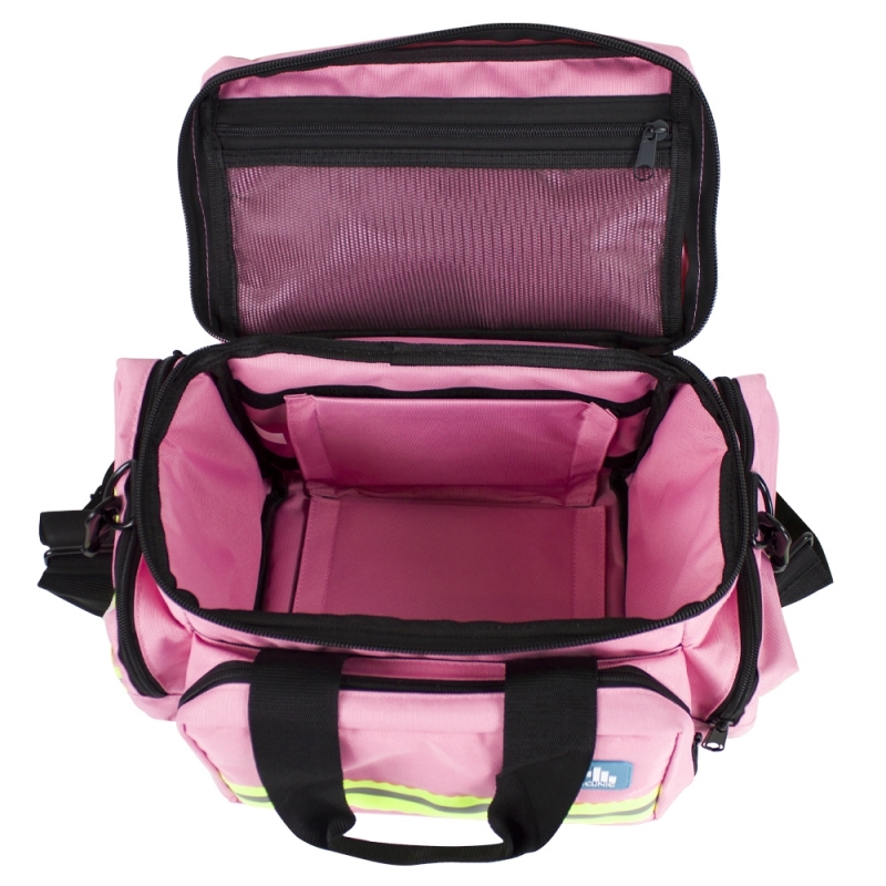 Saco de enfermagem leve e prático, especialmente concebido para os profissionais que necessitam de transportar material médico específico. Conta com duas divisórias internas ajustáveis e um bolso de rede na aba para facilitar a organização do equipamento médico, bem como três bolsos externos, dois dos quais estão abertos e um bolso frontal subdividido no interior com fitas elásticas para manter o equipamento firmemente preso.
