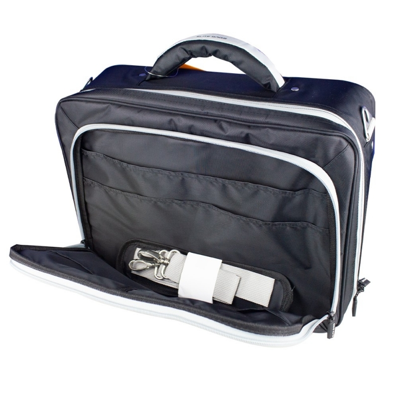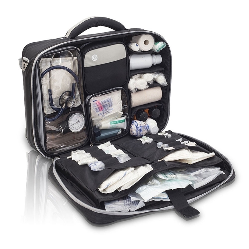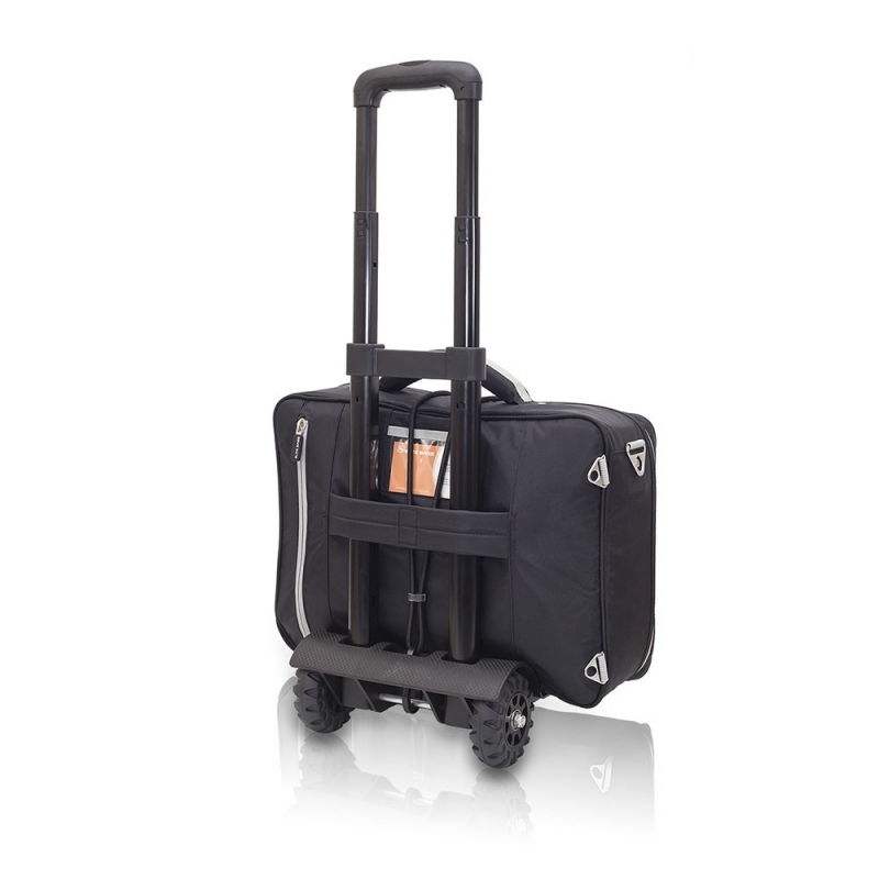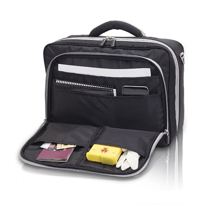 Mala multifuncional com um design muito atual. A sua leveza e resistência extremas tornam-na a aliada perfeita para o trabalho diário. Fabricada com um material repelente à água bitonal de fácil limpeza, combina design e versatilidade permitindo guardar tanto o material de trabalho, como os objetos pessoais. Características: Pega ergonómica e estrutura semirrígida que se adapta ao conteúdo. Alça de tiracolo para o seu transporte. Compartimento dianteiro multifuncional de grande capacidade para os objetos pessoais (computador portátil, tablet, documentação, esferográficas, etc.) Bolso frontal de fácil acesso. Corpo principal com 3 compartimentos extraíveis, com parte frontal transparente, para instrumentos e material. Ampolário isotérmico acolchoado com capacidade para até 38 ampolas. Os compartimentos de velcro permitem que o interior se adapte às necessidades do utilizador, incluem divisórias adaptáveis e uma asa para facilitar a extração dos mesmos. Painel com borrachas elásticas de diferentes tamanhos para material de enfermagem. Bolso interior plano para curativos de grande dimensão. Base antideslizante e impermeável. Fechos-ecler preparados para cadeado no compartimento principal. Faixa para estrutura exterior do carrinho e porta-cartões no painel traseiro. Alças de mochila ocultas na parte traseira da mala. Dados técnicos: Medidas: 40 x 30 x 16 cm Capacidade: 19,2 L Peso: 2,10 kg Material: Bitonal Cor: preta Conteúdo máximo recomendado: 5 kg MATERIAL SANITÁRIO NÃO INCLUÍDO