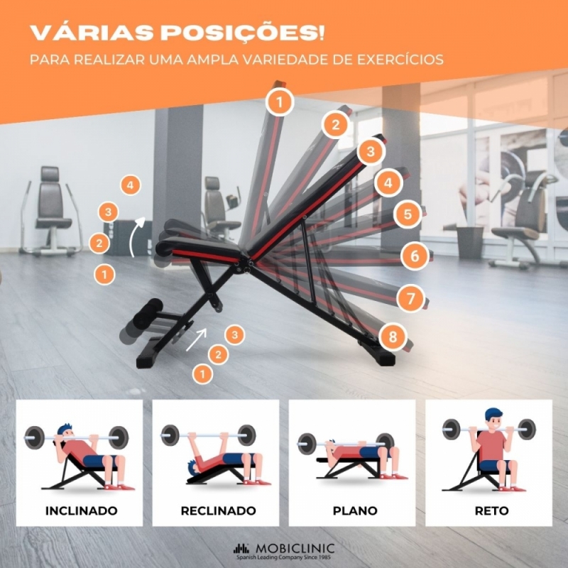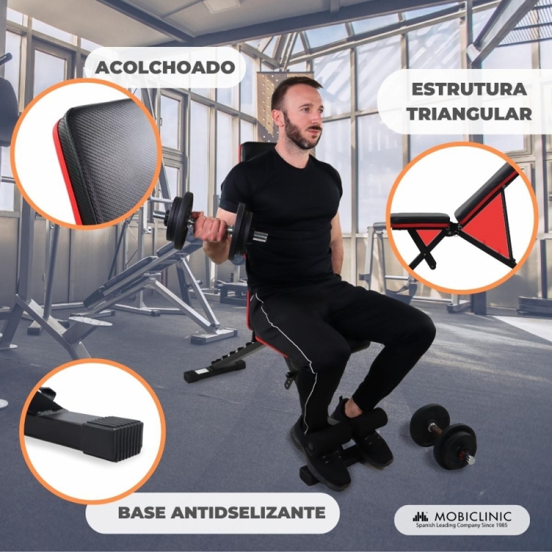 Banco de treino multifuncional | Dobrável ultra compacto | Max 200 kg | Ajustável | Pega de transporte | FlexFit | Mobiclinic