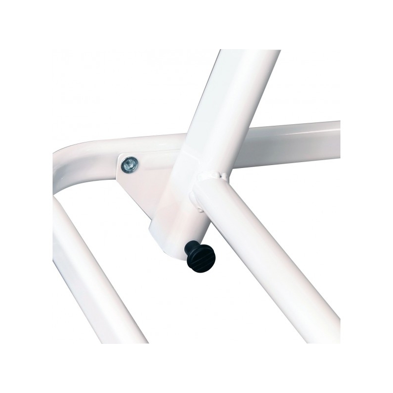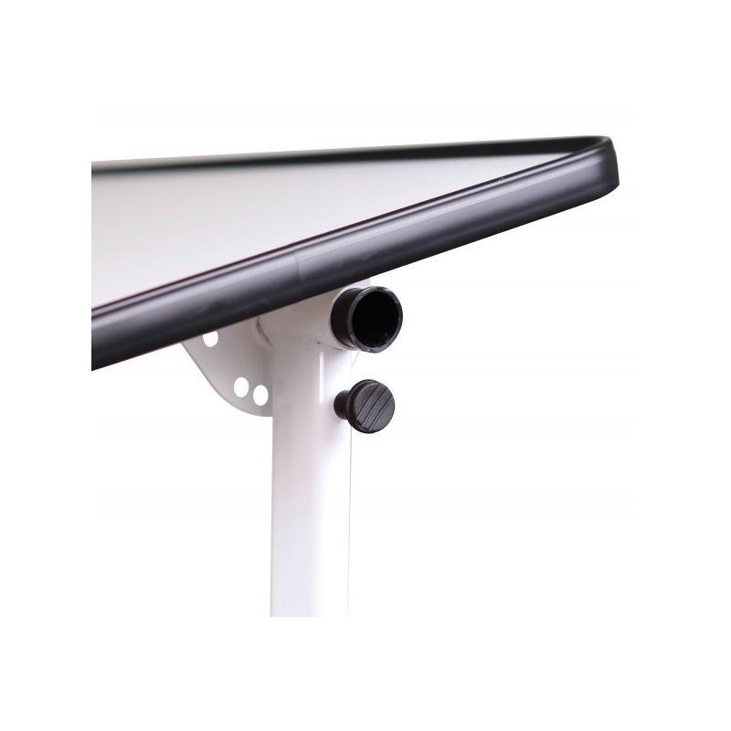 A mesa de apoio branca está coberta com uma borda que evita a queda de objectos e produtos. A coluna de suporte do quadro também permite regular a sua inclinação até 15º, e ajustar a sua altura de 61 a 94 cm, adaptando-se a todas as circunstâncias que a sua utilização permite. Quando não estiver a utilizar a sua mesa auxiliar com rodinhas, pode dobrá-la e armazená-la em qualquer lugar, pois ocupa pouco espaço. Para além de todas estas facilidades, a mesa de apoio ara quarto tem quatro rodas que permitem uma mobilidade total para onde quer que se vá. Duas das rodas incluem um travão para maior segurança durante a utilização.