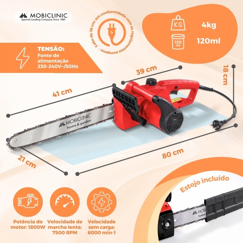 MOTOR DE ALTO DESEMPENHO: Equipada com um potente motor elétrico de 1800 W com velocidade sem carga de 7500 RPM, a motosserra oferece potência constante e eficiente . Este motor de arranque instantâneo não só fornece a força necessária para cortar madeira densa, mas também reduz as emissões e o ruído, tornando a experiência do utilizador mais amiga do ambiente. Por possuir motor elétrico, é mais fácil de manter. Só é necessário trocar a escova de carvão após algum uso.