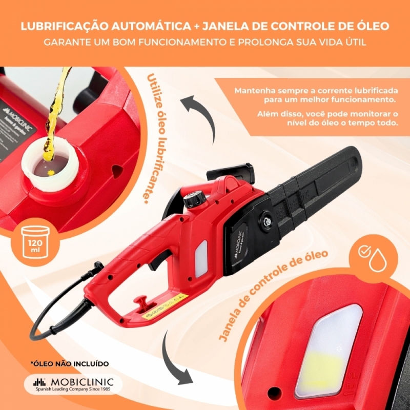 Graças ao seu sistema automático de lubrificação da corrente , a motosserra garante um funcionamento eficiente e prolonga a sua vida útil. Além disso, o fácil acesso ao tanque de óleo torna a manutenção rápida e fácil. Possui janela para monitorar o nível do óleo em todos os momentos.