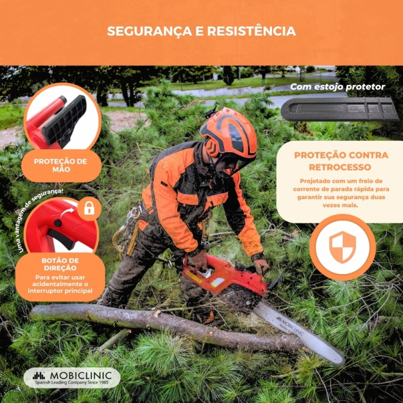 A segurança do usuário é fundamental, e a motosserra prova isso com recursos integrados, como freio de corrente automático e proteção de mão. A motosserra inclui uma bainha para a espada e, para maior segurança, a motosserra possui um dispositivo de segurança para evitar o acionamento acidental da motosserra.