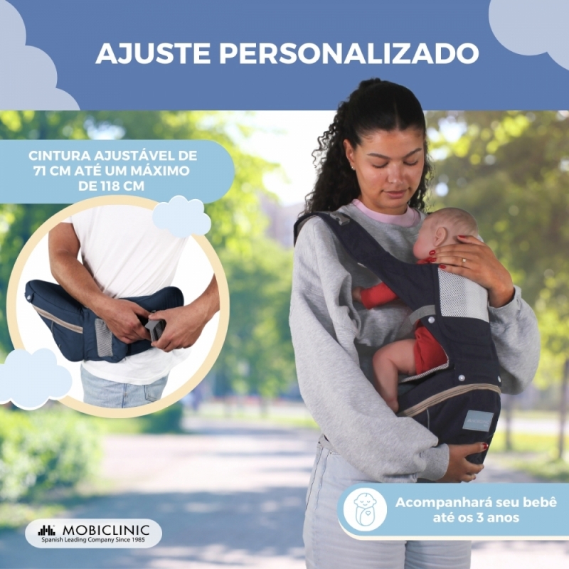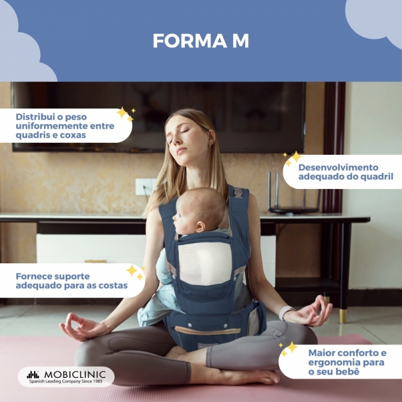 POSIÇÃO ERGONÔMICA EM M: O porta-bebês promove a postura ergonômica do bebê, permitindo que ele adote a posição natural de cócoras . Quando o bebé está sentado, a mochila proporciona uma posição favorável em forma de M, ideal para o desenvolvimento e conforto do pequeno, garantindo um apoio adequado para as costas e ancas.