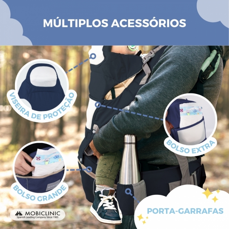 ORGANIZAÇÃO E ACESSIBILIDADE: O porta-bebês inclui um prático bolso com zíper para guardar facilmente os pertences do bebê , permitindo acesso rápido e confortável aos itens essenciais (fraldas, chupetas, chaves, lenços, documentação, celular, lanches, trocos...). . Além disso, possui apoio para garrafa na lateral para maior comodidade.
