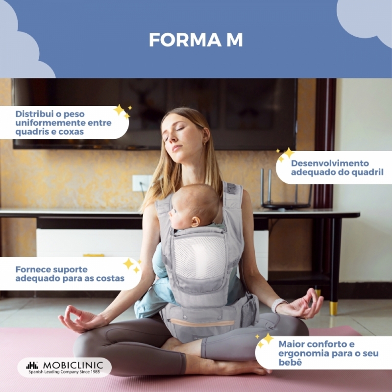 POSIÇÃO ERGONÔMICA M: O porta-bebês promove a postura ergonômica do bebê, permitindo que ele adote a posição natural de cócoras . Quando o bebé está sentado, a mochila proporciona uma posição favorável em forma de M, ideal para o desenvolvimento e conforto do pequeno, garantindo um apoio adequado para as costas e ancas.
