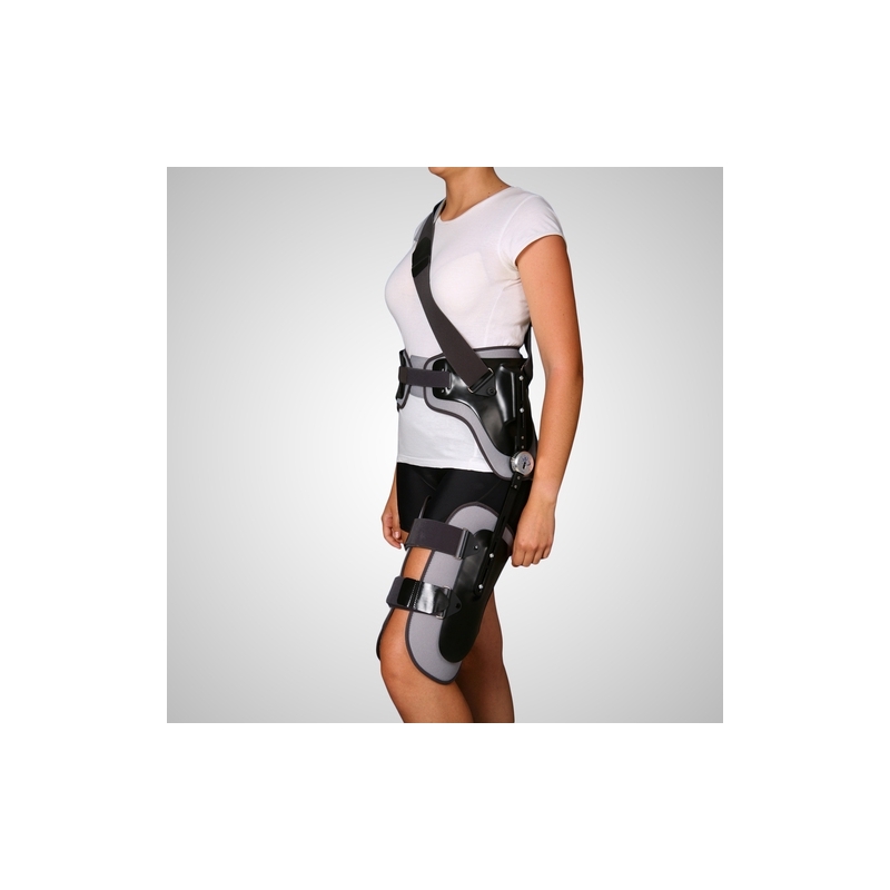 Esta órtese estabilizadora de quadril é feita de polietileno de baixa densidade. Possui banda pélvica em concha com regulagem deslizante traseira e coxa regulável e regulável com velcro. Regulação entre 5º de adução e 25º de abdução sem a necessidade de retirada da órtese. Adaptação da articulação à altura do paciente. Possibilidade de bloquear ou limitar a articulação em flexo-extensão. Cós simples ou de liberação rápida