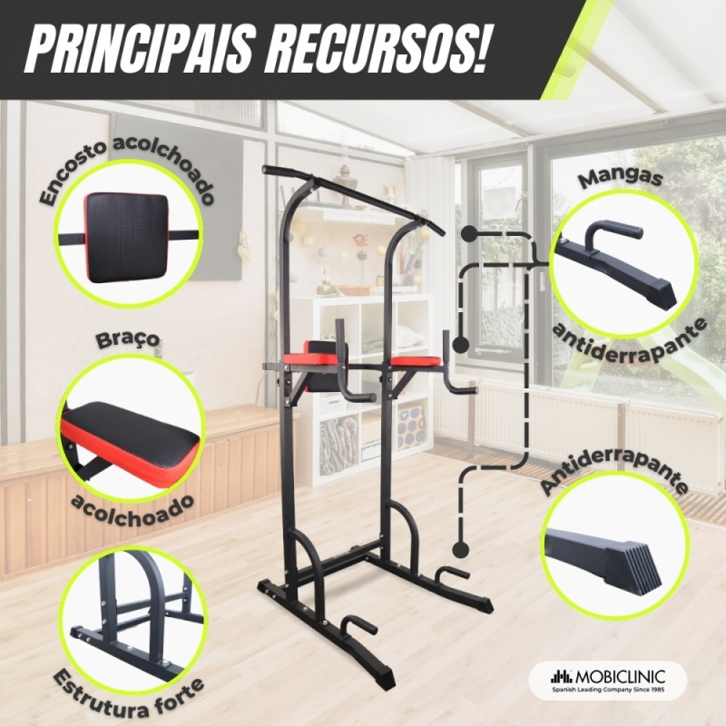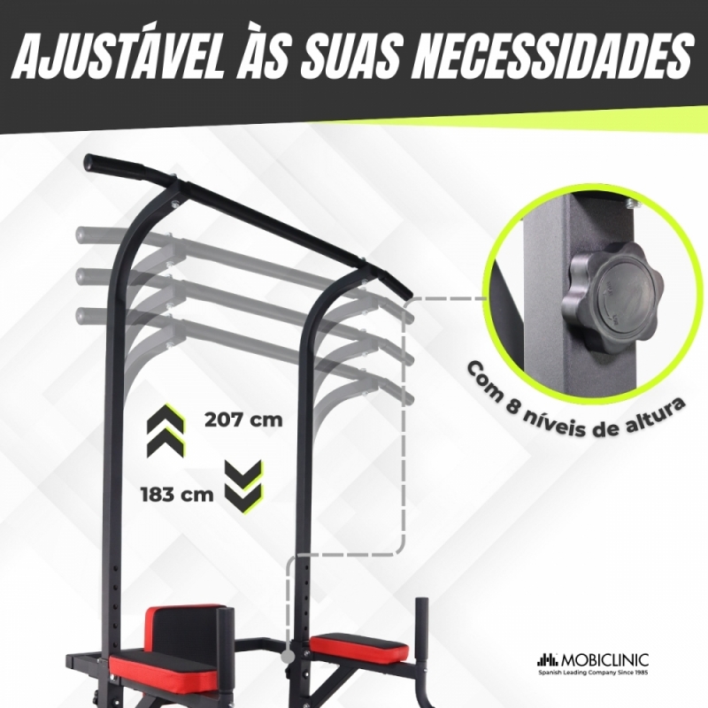O encosto ajustável em altura adapta-se às necessidades de cada pessoa, variando entre 180 e 208 cm. Além disso, suporta até 100 kg, tornando este aparelho adequado para uma ampla gama de usuários com diferentes condições físicas.