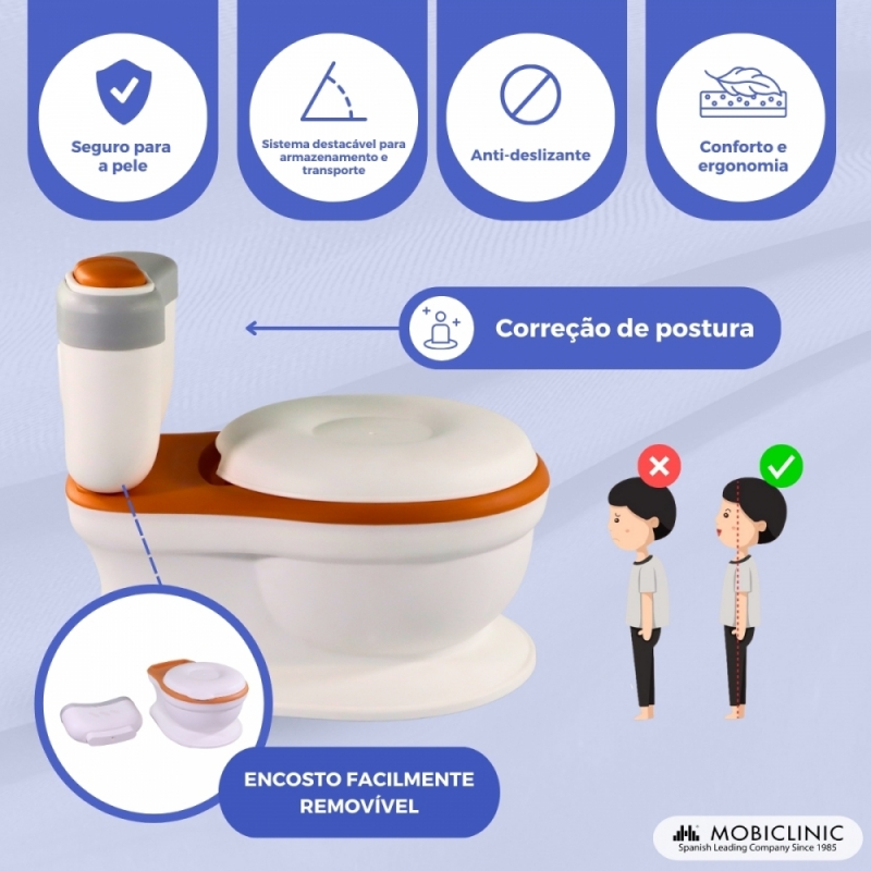 O design desta sanita para bebé foi pensado para garantir o conforto e a postura correta da criança graças ao seu encosto. Da mesma forma, sua superfície antiderrapante evitará acidentes ocasionais ou que o produto se mova facilmente.