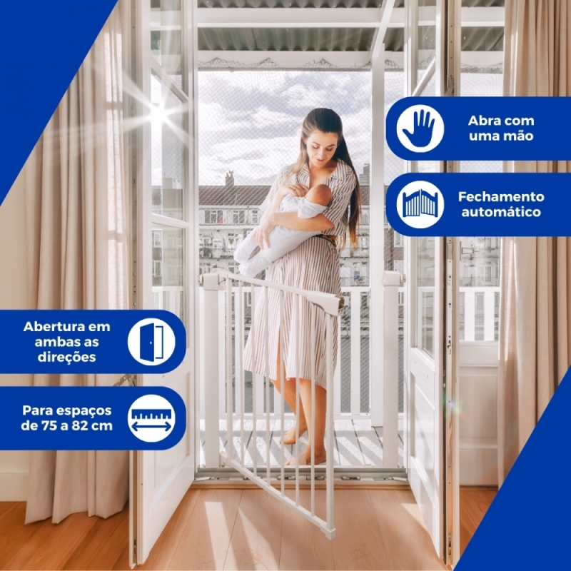 Com adaptabilidade em espaços de 75 a 82 cm e altura de 76 cm , o guarda-corpo Raily proporciona flexibilidade e versatilidade. Além disso, a porta pode ser aberta com apenas uma mão.