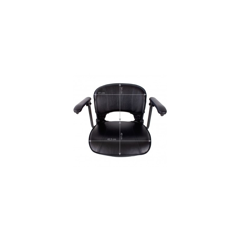 COMPACTA: possui guidão regulável em 3 posições, assento rebatível e giratório (regulável em 3 alturas e 6 posições) e apoios de braços rebatíveis e ajustáveis, além de cesto para colocar objetos.