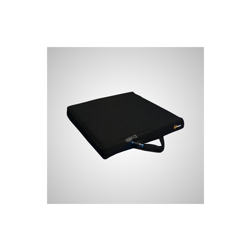 Almofada anti-escaras estética, confortável, resistente e confiável, com capa externa lavável, antiderrapante e com certa resistência ao fogo. Não desliza no assento. Adapta-se facilmente às cadeiras de rodas existentes no mercado. Embalado em uma caixa com alça para fácil transporte e armazenamento. Perfil quadrado. É composto por um sistema de ar regulável por meio de uma válvula de corte e com uma base de espuma ou espuma. Sistema de válvula para regulação do ar interno: adapta a almofada de acordo com o peso e características do paciente. Baseado no " princípio de flotação ". Com tampa externa M1 lavável, antiderrapante e ignífuga, com abertura simples tipo velcro e alça para fácil manuseio. Extremamente leve. Conforto personalizado para cada usuário. Uso recomendado até 100Kg.