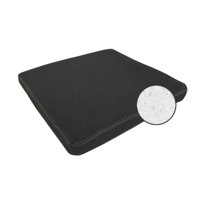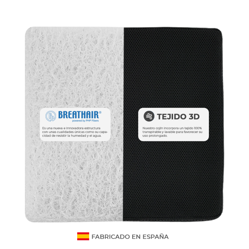 Almofada antiescaras de 5 ou 9 cm de espessura composta por Breathair. O Breathair é uma estrutura nova e inovadora com qualidades únicas, como a capacidade de resistir à umidade e à água. Sua composição é 90% ar, o que o torna extremamente respirável e evita a condensação.