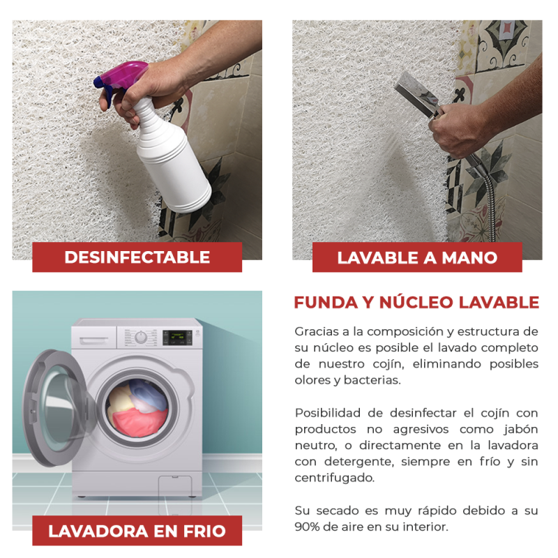 HIGIÊNICO : Uma das qualidades mais importantes da nossa almofada anti-decúbito é a sua higiene. Ao contrário de uma almofada convencional em que apenas a sua capa é lavável, a almofada anti-decúbito tem um núcleo impermeável com o qual temos a possibilidade de a lavar na máquina de lavar sem retirar.