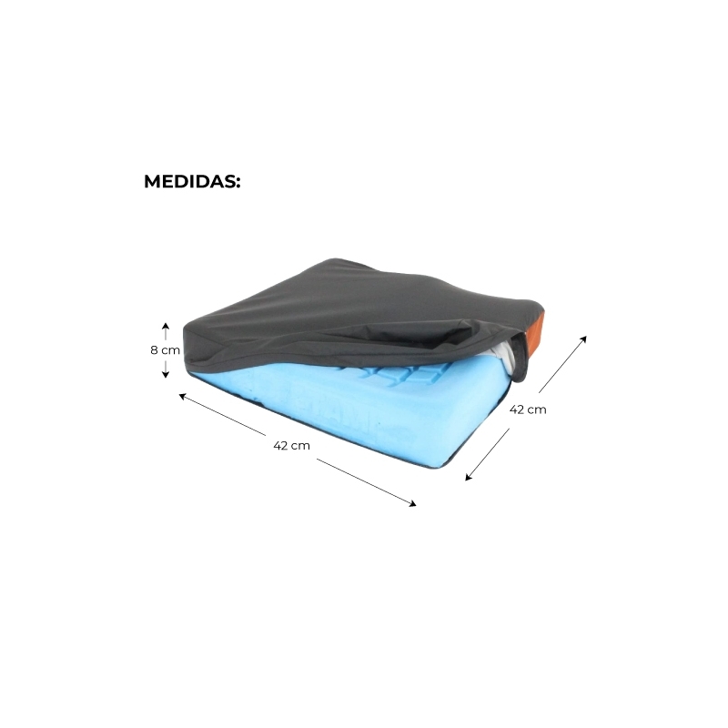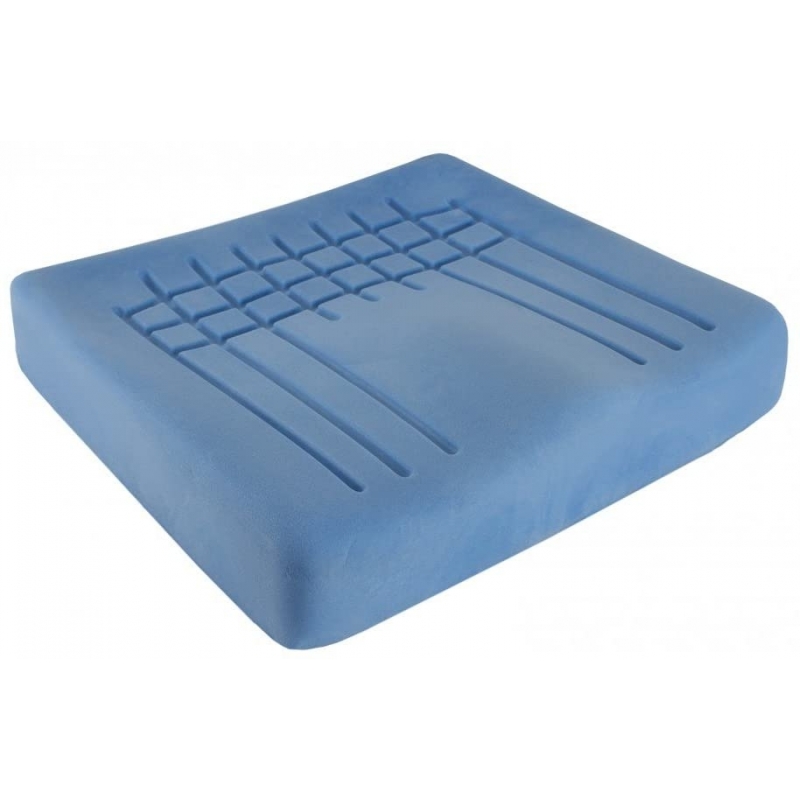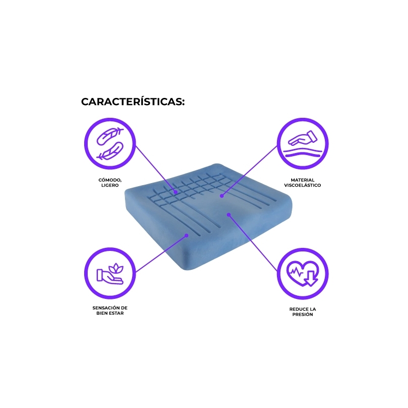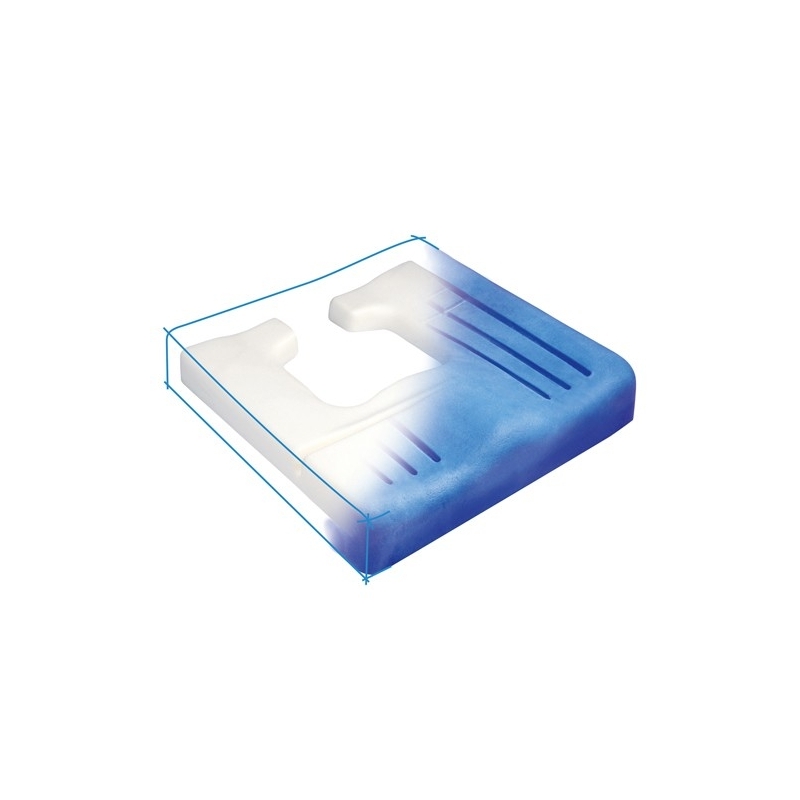 Almofada ergonômica em espuma visco-elástica com efeito memória e inserção ergonômica. Reduza as pressões nas áreas de maior risco: sacro e ísquio. A inserção é dimensionada em relação ao ísquio.